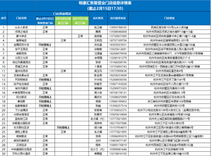 除了12家加油站站點(diǎn),目前明康匯生鮮已有47家門(mén)店復(fù)工營(yíng)業(yè),其中杭州正常營(yíng)業(yè)的27家,消費(fèi)者可以就近購(gòu)買(mǎi)。正常營(yíng)業(yè)的門(mén)店如下: